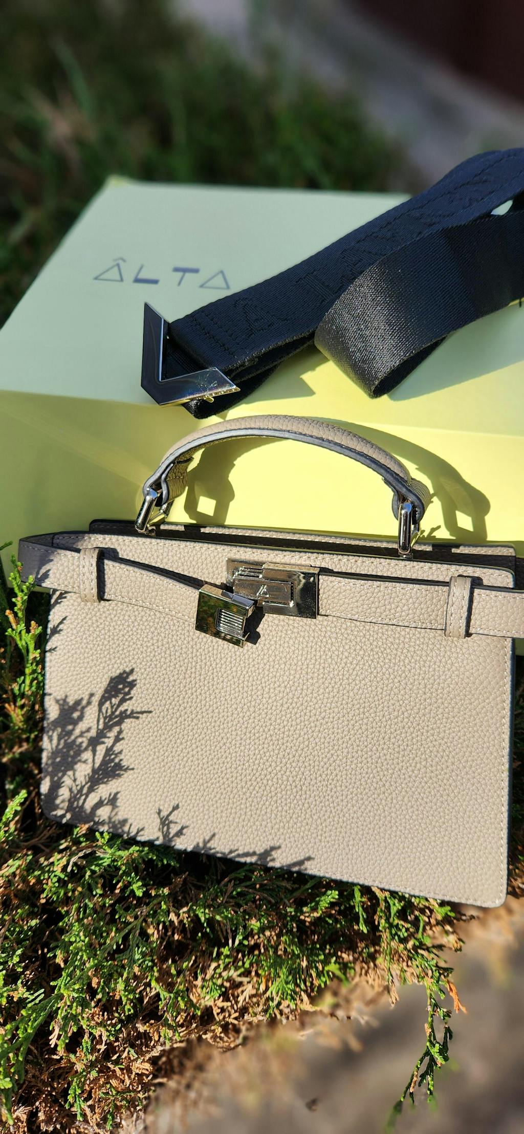 A mini bag made of top grain togo leather in Army grey color.  Embellished with tone-on-tone stitching, and a simple magnetic belt strap lock.  Featuring black internal linings, two compartments separated by a stiff partition. Front compartment with internal sleeve pocket, and closure through the belt strap lock, while back compartment uses zip closure.  Silver-finish metalware.